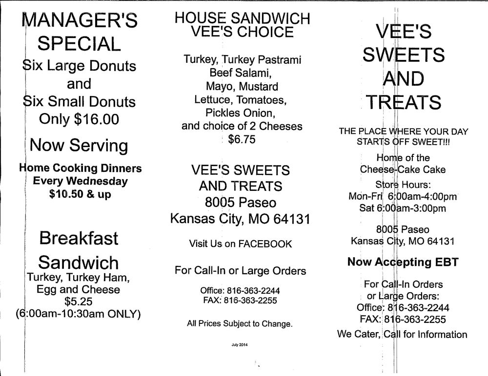 "Vee's Sweets and Treats" is a delightful bakery and deli located in Kansas City, MO. They offer a variety of delicious treats, from breakfast sandwiches to cookies, cakes, and pies. Customers rave about the quality of the food, with favorites like the Turkey Breakfast Turkeyham, Chocolate Chip Cookies, Sweet Potato Pie, and giant apple fritter. The friendly staff and cozy atmosphere make for a great dining experience, even if there is no indoor seating. With great value for money and fresh, tasty ingredients, Vee's Sweets and Treats is a must-visit for anyone with a sweet tooth in Kansas City.